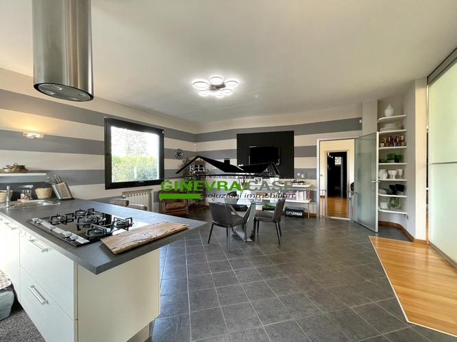 Un elegante viottolo in pietra ci conduce all’ingresso, dove ci accoglie un luminoso salone-zona pranzo, dove ampie vetrate incorniciano il verde del giardino e il portico coperto, ideale per colazioni all’aria aperta o aperitivi al tramonto. La cucina, raffinata e funzionale, può aprirsi completamente al living per creare uno spazio conviviale, o isolarsi grazie a porte scorrevoli in vetro smerigliato, preservando l’intimità. Un grazioso bagno di cortesia completa questo piano, pensato per accogliere gli ospiti con stile.
